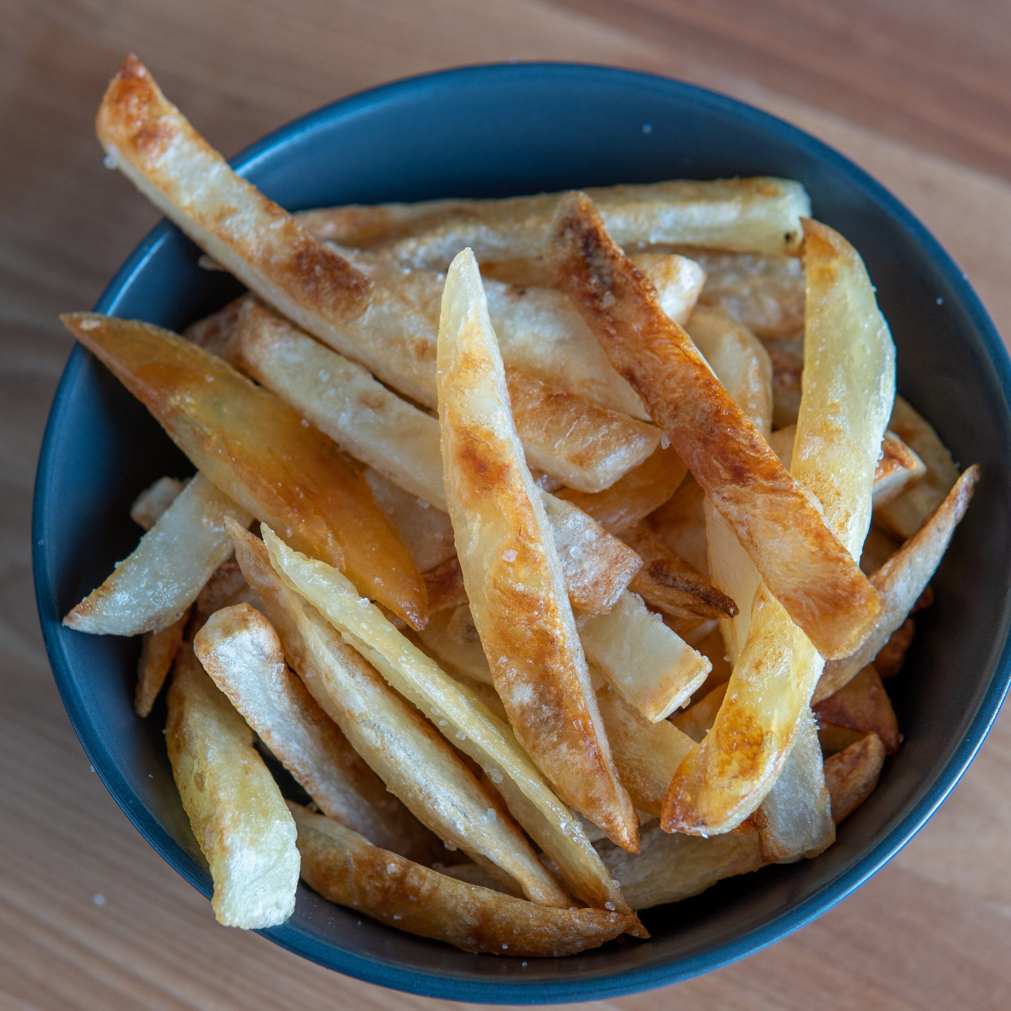 Set a paper towel in a bowl. Pour in the fries and immediately a pinch of salt. Toss the fries with the paper towel so it absorbs the excess oil. Note: Feel free to add spices, fresh herbs, cheeses, or any flavorings of your choice during this stage. Serve and enjoy.
