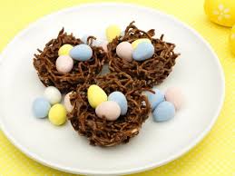 Form little clusters on foil, placing candy eggs on choice in groups of three in middle of each next, and set tray in refrigerator for nests to harden.